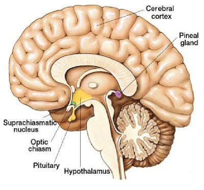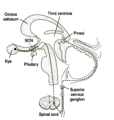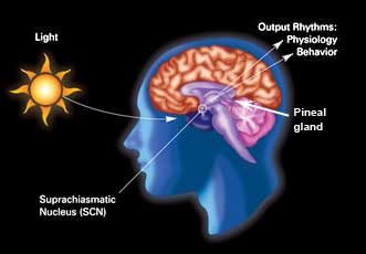 Signals from the SCN travel to several brain regions, including the pineal gland, which responds to light-induced signals by switching off production of the hormone melatonin. The body’s level of melatonin normally increases after darkness falls, making people feel drowsy. The SCN also governs functions that are synchronized with the sleep/wake cycle, including body temperature, hormone secretion, urine production, and changes in blood pressure.