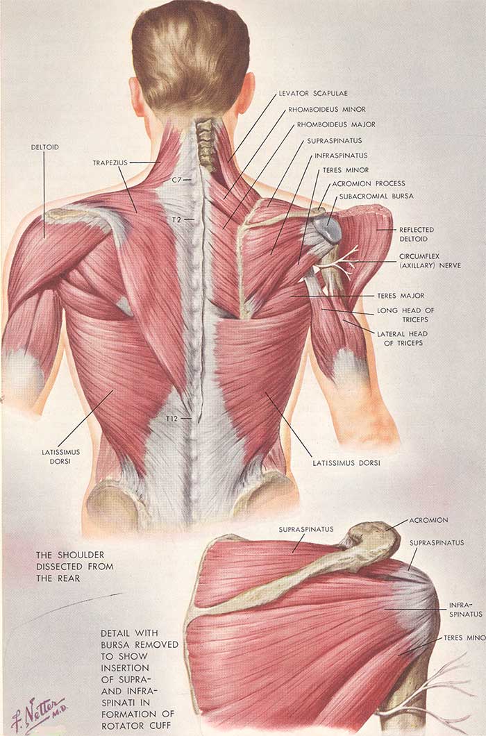 This state of postural shortening of muscle groups can often persist for years such as in musicians who started playing as children. The long term effects of playing the Oboe, for example, where the arms are 'pinned' to the sides of the ribcage and the pectoralis minor is very tight and short in the front can be deleterious. At the same time the 'rotator cuff' muscles are also held rigidly. This has the effect of preventing external rotation and elevation of the arm. Thus, after years of this usage, the tethering will take place and the full range of shoulder joint movements will be lost unless stretched and mobilised.